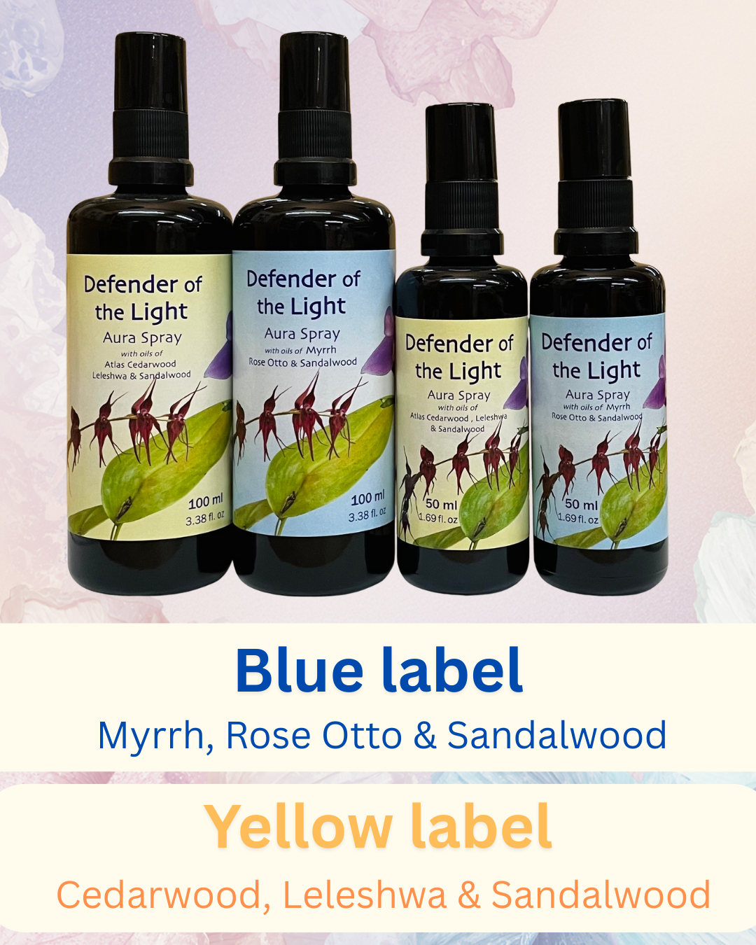 Our scented Aura Sprays come in 2 sizes (50ml or 100ml) and 2 aroma choices (yellow label or blue label options)