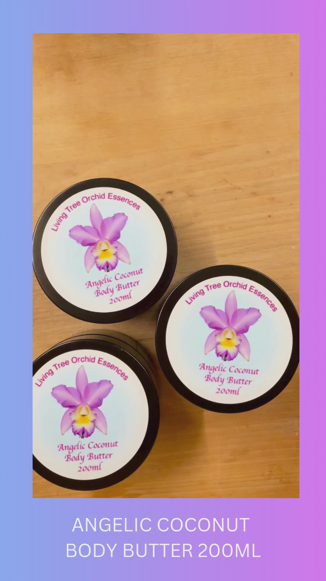 This Body Butter has the following physical ingredients: Spring water, Jojoba oil, Almond oil, organic Safflower oil, emulsifying wax, preservative ‘K’, wheat-free & GM-free Vitamin E oil, vegetable glycerine, coconut aroma flavour; etheric infusion of LC Angel Love (Angelic Canopy).